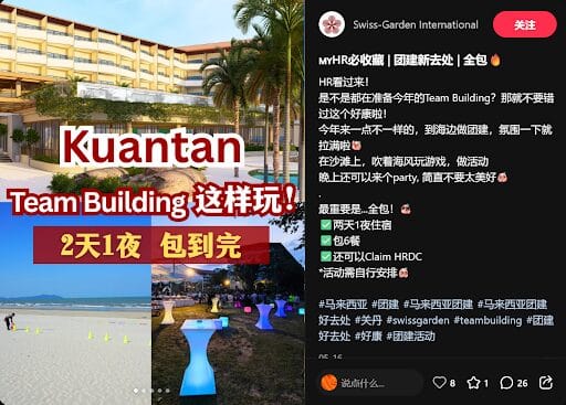Source: Swiss-Garden International 想为公司安排一个轻松又有凝聚力的Team Building?不妨把目标锁定在马来西亚关丹(Kuantan)——这片东海岸的小天堂,不只拥有迷人的海滩风景,更有丰富多样的团建配套,让你轻松搞定吃住玩! 🏖 海边团建活动,一次玩个够! 沙滩团建:游戏互动氛围满分 Swiss-Garden Kuantan 提供专属的宽敞海滩空间,适合举办各类户外活动: 海边派对:浪漫又 Chill 晚上还有“海边灯光派对”,伴随晚霞海风,变身 chill 派对场地,不管是 BBQ、表演、游戏时间,仪式感拉满!适合打造难忘的夜晚。 🏨 酒店住宿全包:宽敞舒适房间任你选 大床 or 双床?都能选! Swiss-Garden Beach Resort Kuantan 提供舒适房型,大床/双床随心选,部分房型还配有阳台,让你清晨就能一览无敌海景。适合不同团队结构需求,从小组 leader 到部门团体皆宜。 环境优美、翻新完成 酒店近期刚完成翻新,采用现代简约设计,整体氛围舒适大气,无论是会议、聚餐还是放松时光,都能感受到专业且放松的氛围。 🍽 吃的部分?直接包 6 餐! 担心饮食问题?不必!此团建方案已包 6 餐: 对组织者来说简直太省心,完全不用烦恼场地、菜单或人数协调问题。 💰 花费预算 & HRDC Claim 说明 这项团建配套可申请 HRDC claim,节省预算不是梦! 价格包含: ✅