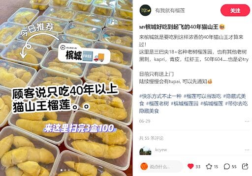 Source: @有我就有榴莲 隐藏在Junjong的老树榴莲秘境 来到槟城,榴莲控一定不能错过隐藏在三巴央(Junjong)的老树榴莲园。这家园主精选18年以上树龄的猫山王榴莲,有些甚至是超过50年的榴莲树,风味浓郁、香气四溢、果肉厚实,一吃上瘾! 必吃品种盘点:猫山王、红虾、黑刺应有尽有 这里不仅有招牌猫山王(Musang King),还囊括了老树红虾(Red Prawn)、黑刺(Black Thorn)、Kapri、青皮(Green Skin)等多款高品质榴莲,满足不同吃货的味蕾喜好。 Set推荐搭配,价格透明,适合初次尝试 每盒约350g,价格亲民,适合团购或自用,建议直接选择mix set,一次试遍几种经典。 2025 马来西亚旅行期间最佳食用时节 每年榴莲季大约在5月至8月之间,2025年计划前往马来西亚的朋友,建议提前预定或关注他们家的上门服务,部分品种还可送货上门。 槟城榴莲园交通&Tips 推荐理由|槟城隐藏美食新宠 相较旅游区内高价的榴莲摊,这家隐藏版榴莲园提供的是老饕级别的品质与性价比,让你真正吃到“飞起来”的猫山王,连吃了40年的资深顾客都赞不绝口! ✅ Summary(English) Title: Best Musang King Durian in Malaysia 2025 – Hidden Junjong Orchard GuideJunjong in Penang is a must-visit for true durian lovers! Featuring 40+ year-old Musang King trees and