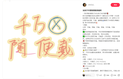 ✨ Credit: @小希日记(小红书) 年抛毁眼、含水量玄学、直径选错秒变“塑料感”…… 作为细节控,我踩过的坑不计其数😢这篇是我用6年佩戴经历整理出的新手避坑指南,涵盖从周期、材质到实际佩戴体验,收藏=省眼睛+省钱包! 🔍 五大选购关键点 1️⃣ 周期选择 ✅ 周抛/月抛:性价比最高,适合学生党/常规通勤✅ 日抛:最卫生,适合敏感眼/偶尔拍照(💰贵但值得)❌ 年抛/季抛:易滋生细菌,卫生问题频出,不建议使用 2️⃣ 直径选法 3️⃣ 含水量避雷法则 ✔️ 推荐区间:38%-45%(稳定水润)❌ 高于50%:初戴湿润,长时间反而“倒吸水分”,导致干涩 4️⃣ 透氧量(决定你戴多久会干) 5️⃣ 材质排名 🥇 硅水凝胶:高透氧+佩戴舒适,适合长期佩戴或敏感眼🥈 普通水凝胶:平价但容易干,建议控制佩戴时长(≤6小时) 💬 用户实问实答 👤 @3F_^lucrime:“之前戴過一次美瞳总觉得哪裡怪怪的?老师有什么建议吗”👉 @小希日记:“建议选14.0mm以内的棕色系,淡妆也自然,拍照更出片!” 📊 此篇笔记点赞突破1万+,评论区成了“美瞳避坑交流区”,尤其学生党直呼:“早看到这篇就好了!” 这几年美瞳消费趋势正在转变——“好看”已不再是唯一标准,佩戴舒适度、健康安全成为新关键词。评论区提到“角膜损伤”“透氧量”等专业术语的频率明显上升,也说明了用户在选购时越来越理性。 More and more users are moving from “just pretty” to “safe and wearable”. Comments about