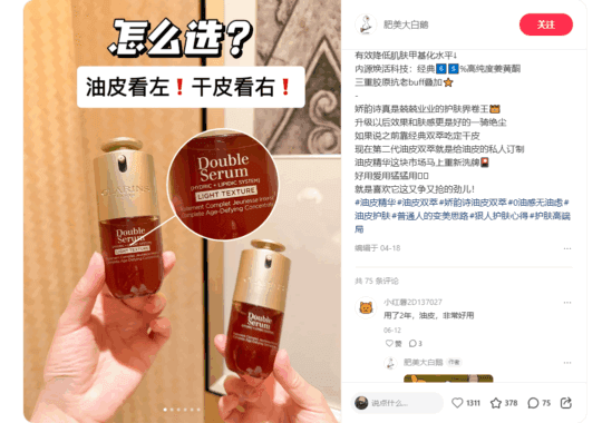 Credit : @肥美大白鹅(小红书) 🌟【油皮救星降临!第二代双萃全面解析】 作为资深油皮,曾对娇韵诗经典双萃又爱又恨——抗老维稳没得挑,但夏季油腻到能煎蛋🍳!今年终于等到油皮专属版,直接颠覆认知: 🍃 质地革命  ▸ 0油感科技:比经典版轻盈60%,水感质地秒吸收,完全不黏不闷▸ 7:3黄金水油比:模拟健康皮脂膜结构,27种活性植萃直达肌底▸ 1小时内修护屏障:从根源调节皮脂分泌,平衡油光和水分⚖️ 🌿 成分升级加持 ✔️ 水飞蓟浓度↑300%:控油同时紧致毛孔,改善油皮暗沉粗糙✔️ 六重植萃抗氧阵容(新增七叶树+沙棘仁):角质代谢加速,提亮焕肤效果拉满✔️ 雪绒花核心植萃:高原抗压王者,击退暗沉、泛红,素颜也发光💡 💧【干皮党别急!第九代经典版同步升级】  ▸ 法国巨型芦竹:科研证实可延缓肌肤老化甲基化,恢复皮肤“年轻开关”▸ 65%高纯姜黄酮精粹:三重激活胶原蛋白,提升紧致感,淡纹轮廓更清晰 🎯 升级重点总结 用户互动精选 黑糖可可:“两种都需要乳化吗?咋乳化呢?” 肥美大白鹅:“精华滴掌心,指腹打圈20秒至乳白色~” 黑糖可可:“上一瓶都是直接用的(捂脸)” 笔者感言 从“夏季劝退款”变成“全年无限回购”,娇韵诗这次对油皮用户的理解太到位。质地、成分双管齐下,既控油又不牺牲功效感受,再加上干皮版继续升级,几乎是精华界少有的“双线齐飞”。真正做到:肤质不同,体验同样优秀! Reporter Insight “Clarins’ dual-strategy approach highlights the growing trend of market segmentation—customizing formulations within the same product line for different skin