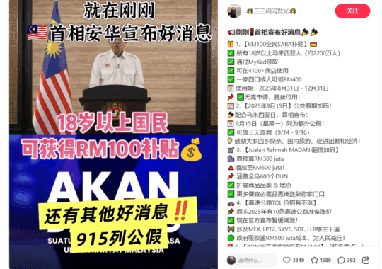 Credit: 🌟三三闪闪发光🌟 (小红书) 📢刚刚‼️马来西亚首相亲自宣布2025年8项重磅好消息🎉 🎉 快收藏!全马人民都能受惠👇👇 🎁 1. RM100全民SARA补贴 ✅ 所有18岁以上马来西亚人(约2200万人)✅ 通过MyKad自动发放,无需申请✅ 可在4100+家商店直接使用✅ 一家四口可共领RM400🗓️ 使用期:2025年8月31日至12月31日 💡 如何知道有没有领到? — 只需8月31日后,带上MyKad去消费就能验证! 📅 2. 2025年9月15日额外公共假期! 🗓️ 9月15日(星期一)列为马来西亚日特别公假✅ 可享三天连休(9月14-16)💡 鼓励国人回乡、团聚、国内旅游! 🛍️ 3. Jualan Rahmah MADANI计划翻倍加码 🔺 原预算RM300 juta ➡ 增加至RM600 juta📌 覆盖全国600个DUN✅ 扩大商品类别 & 地点,必需品直接送上门! 🚗 4. 高速公路TOL暂缓调涨 ✅ 原预计涨价的10条大道将继续维持现价📌 包括 MEX、LPT2、SKVE、SDE、LLB 等主干道🟢 政府吸收超过RM500