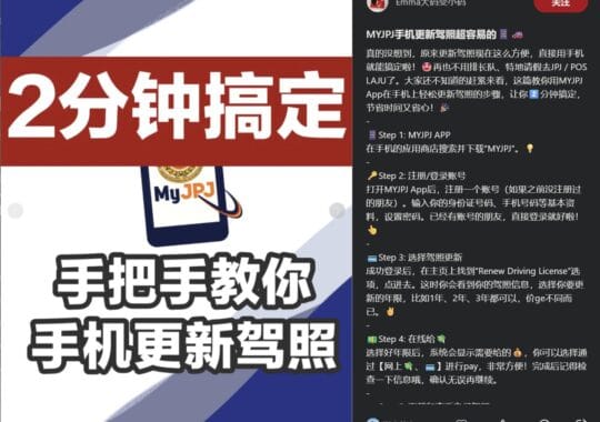 📌 Source: @Emma大码变小码 马来西亚驾照更新进入全线上时代! 随着MYJPJ App功能全面升级,马来西亚驾驶人士终于可以不跑JPJ、不排队、不请假,只需一台手机就能完成驾照更新。对于在2025需要续驾照的你,这篇就是最实用、最高效的教程! MYJPJ线上更新驾照步骤详解 Step 1 – 下载 MYJPJ APP Step 2 – 注册 / 登录账号 MYJPJ驾照更新流程全解析|不出门也能搞定 Step 3 – 选择“Renew Driving License”功能 Step 4 – 在线付款(FPX / 信用卡均可) Step 5 – 下载电子驾照(e-Lesen) 常见疑问 & 用户反馈 Q1:选择“Digital Sahaja”是什么意思? 意思是你只会获得电子驾照,不会收到实体驾照。是否选择取决于你是否仍需随身携带卡片版本。 Q2:为什么不同用户付款金额不一致? 根据年份不同,价格略有浮动。一年 RM25,十年 RM265 属于常见情况。具体价格以系统显示为准。 📌 Hashtags(优化与补充) #Malaysia2025