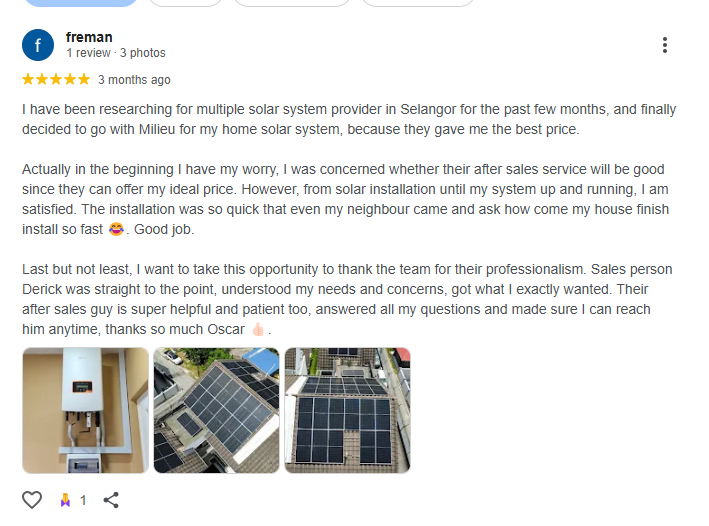“I have been researching for multiple solar system provider in Selangor for the past few months, and finally decided to go with Milieu for my home solar system, because they gave me the best price.