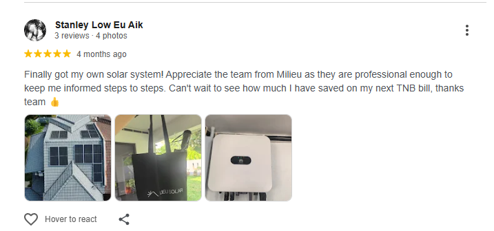 “Finally got my own solar system! Appreciate the team from Milieu as they are professional enough to keep me informed steps to steps. Can’t wait to see how much I have saved on my next TNB bill, thanks team 👍.”