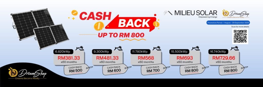 With these featured solar panel packages available through Dreamshop, Malaysians can now enjoy the benefits of clean and affordable solar energy without the upfront financial strain. Whether you’re looking for cheap solar panel financing, a solar panel supplier in Malaysia, or the best solar panel installation Malaysia offers, Dreamshop makes it easy to find the perfect solar system for your home. From Milieu Solar’s cashback offers to GeoSav’s substantial vouchers, there are numerous ways to make your solar energy investment more affordable. With zero EPP from participating banks, you can pay for your solar panels in easy monthly instalments, starting from RM381.33 per month, ensuring that you can enjoy energy savings and contribute to a greener future.